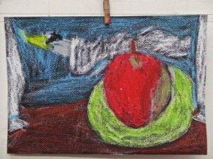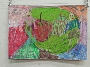 さて、アトリエでは「自分の制作」という個人制作を軸にすすめていますが、ときおりクロッキーや季節の制作がちょこちょこ入ってきます。今回も描きたい!という希望者をつのって、さっそく描いてもらいました。今回は基本クレヨンで、油絵のようにぐりぐりと。クレヨンは混色も自在で、削ったり、ひっかいたり、あなどれない可能性をもった画材だと感じています。色と形を別々に見るのではなく、同時に描き進められ、絵と自分との間のやりとりを肌に近い所で感じられる魅力が有ります。