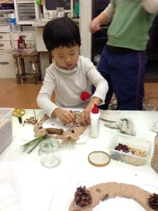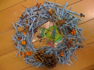 ◎オガクズ粘土のリース作り。手作り粘土のリースにお散歩で集めた木の実で飾りました。