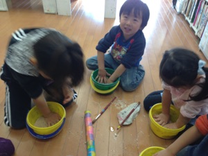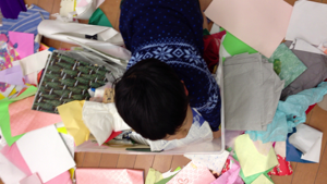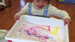 色紙の海にダイブしたり、箱にもぐったり。 絵の具ぺたぺた、粘土こねこね。