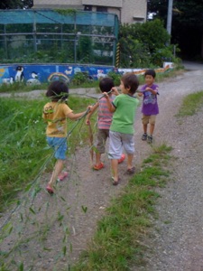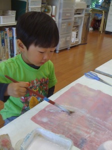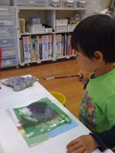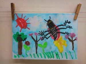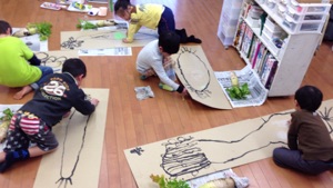 このクラスでは外へ材料を探しに行ったり、虫や野菜をとってきて絵を描いたり、