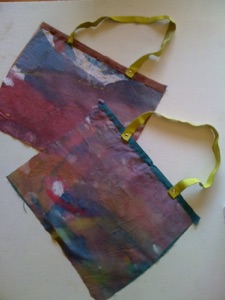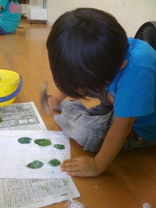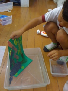 ◎紙すき。牛乳パックを原料にオリジナルもよう入りのハガキを漉きました。