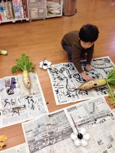 ◎見て描こう。年長さんがチャレンジ!畑から大根をひっこぬいて、よく見て描きました。