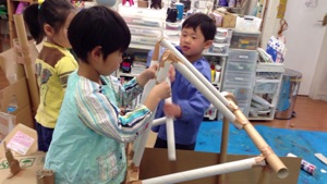 空き箱、折り紙、セロテープ。くっつけたり、つなげたり、ちょんぎったり。なにやら作品でいっぱい!