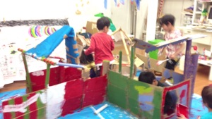 ◎秘密基地作り。年長さんの締めくくり。段ボールの基地作りで協同制作にチャレンジしました。