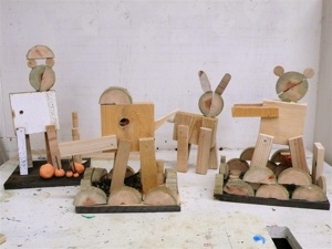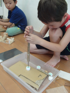 ◎2学期:木の車作り。板を切って、木っ端で形を作り・・・