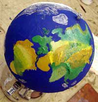 油絵クラスの制作した地球。かなりな力作です!何ヶ月もかかってビーチボールを張り子にし、下地を塗り、大陸を盛り上げ、地表を書き込んでいきました。 (左)6年生制作。この写真じゃよくわかりませんが、なんと海流まで描き込んでいるのです。とってもリアルで精緻な作品です。地図とにらめっこして黙々とがんばりました。その集中力・・私も見習いたい(^^;) (右)4年生制作。とってもきれいな色彩。球体に地図を描くのがむずかしくて一時はどうなる事かと思いましたが、色を塗り始めて輝き出しました。